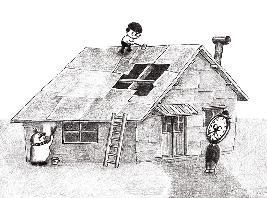 | Grandpa Koharu: "Are you allowed to build a house on national land without permission?" Tama: "We're not human, so human laws don't apply to us." Pochi: "It's like a little bird building a nest in a tree in the park." |