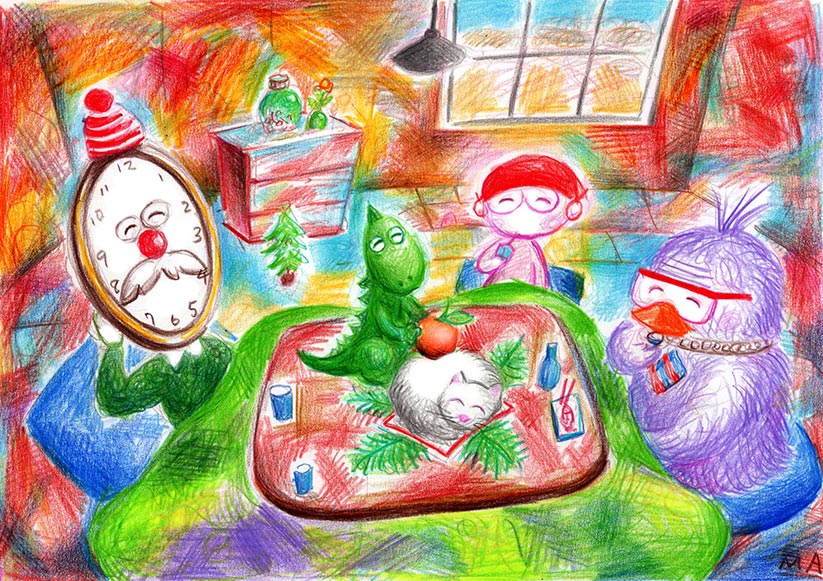 小春じい「今年は、立派なお供えが用意できたな」ポチ「眺めているだけで、お酒が美味くなります」タマ「来年は、みんな元気で、いい年になりそうだ」 炬燵は素晴らしい。寒い夜に、思い浮かべただけで心まで温かくなる。だから「小春じい」で炬燵を描くのは4枚目になった。