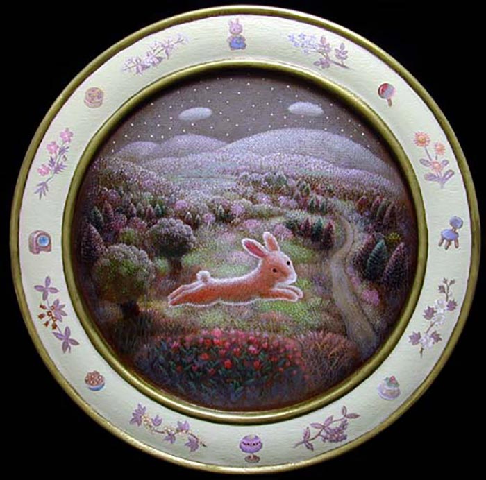 p-126「月光・Moonlight」個人蔵 野ウサギの足音はとても大きい。 昔、福島の山中で野営していると、ドスンドスンと足音がして、 熊だと思って飛び起きたら野ウサギだった。 実際の熊は忍び足で音がしないそうだ。