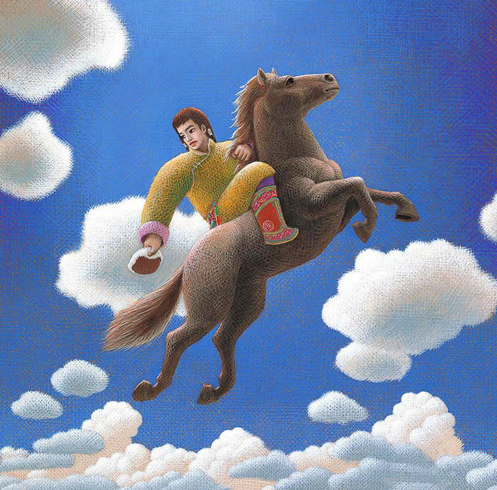 p-128「青いナムジル表紙・Pegasus」パロル舎 個人蔵 モンゴルの馬頭琴伝説の絵本。 日本では「スーホーの白い馬」が知られているが、 モンゴル本国では逆に「青いナムジル」が広く語り継がれている。 「青いナムジル」の「青」はカッコウのたとえである。 モンゴルのカッコウは青味が強く、青色に例えられるようだ。 絵は天馬ジョノン・ハルにまたがる青年ナムジル。 ジョノン・ハルのハルは黒毛を意味する。
