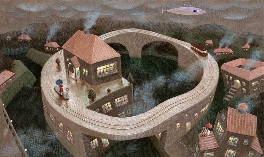 p-13「グーが来た・終わりのない旅・Journey」 寒い雨の中で女の人が電車を待っていた。 彼女は寒い雨が大嫌いだった。 仕事を失敗したり、しかられたり、嫌なことばかりだった。 好きな人との恋もうまくいかず、とても疲れていた。 それでも、いつものように電車に乗って仕事へ出かけようとしていた。