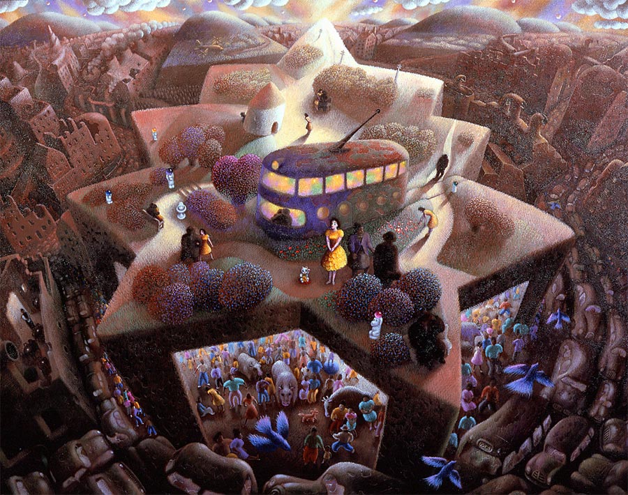 p-24「鉄の河・Iron River」 バニーコルアート社蔵 「自然がそこにあって、鳥が歌い、森がささやく。なんと素晴らしいことか。 あなたたち白人は優れたテクノロジーを私達にもたらした。しかし、テクノロジーは私達を幸せにしない。 私達の幸せは自然とともにあり、自然が消滅すれば、私達もほろびる」-- アマゾン、クリチカ族首長の言葉。廃墟は自然に帰る姿。だから美しい。