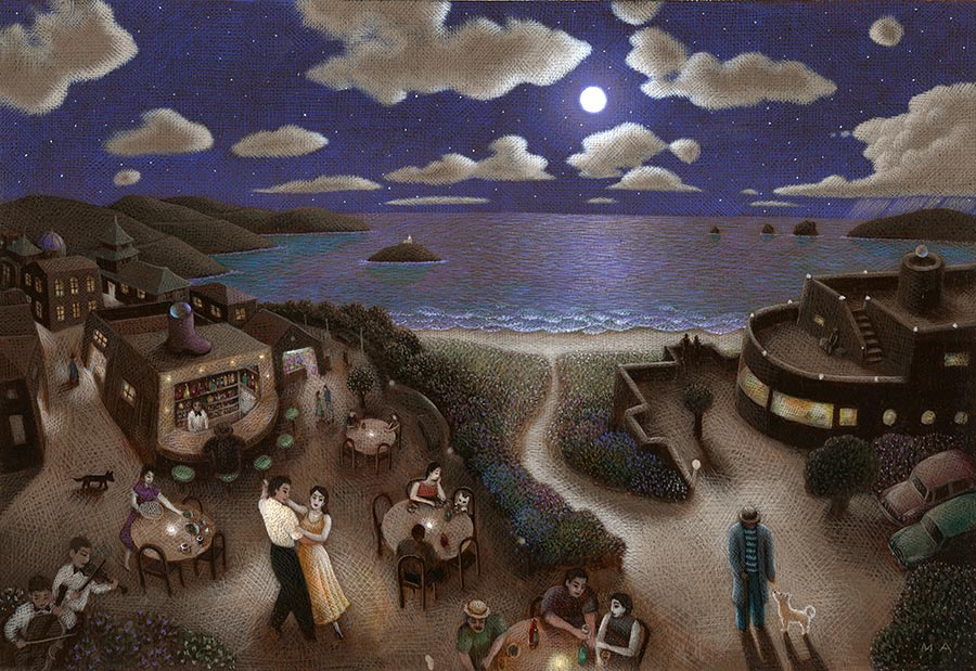 p-31「風の音・夜風・night wind」6号 個人蔵 すぐそこまで 秋が 来ていた 冷たい夜風にのって 楽団の 演奏が 聞こえた 妻と 行ったダンスホールや 友人達と にぎやかに 遊んだ夜を思い出した