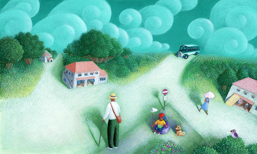 p-58「おじいちゃんのバス停・バスが来た・bus stop」 個人蔵