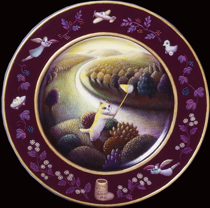 絵皿の外枠に、ニャンコが捕まえようとしているものを説明的に描いた。捕虫網で風と天使を捕まえられたら楽しい。
