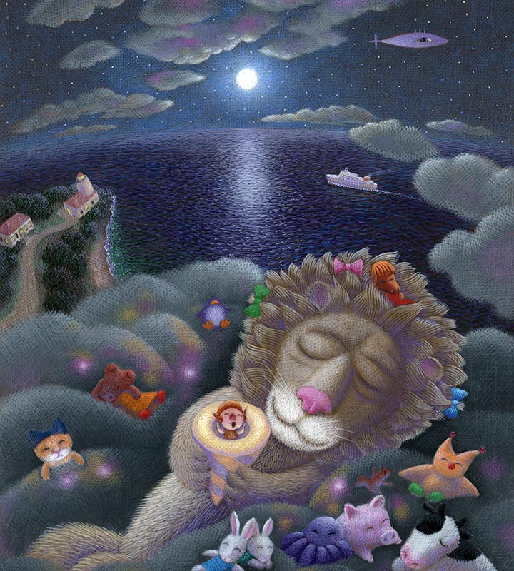 p-16「グーが来た・心地よい眠り・comfortable sleep」 グーの声を聞くと、町のみんなとライオンは心地よく眠った。 みんなは、雲のふとんで ライオンと一緒に眠っている夢を見た。 ライオンのいびきは雷みたいに大きかったけど、オーケストラのように心地よく聞こえた。